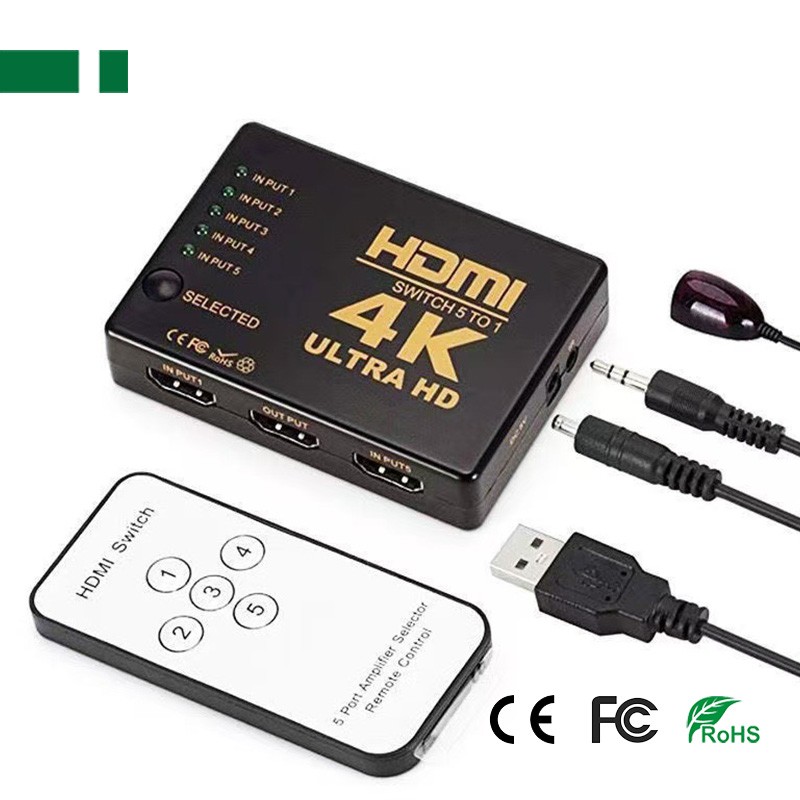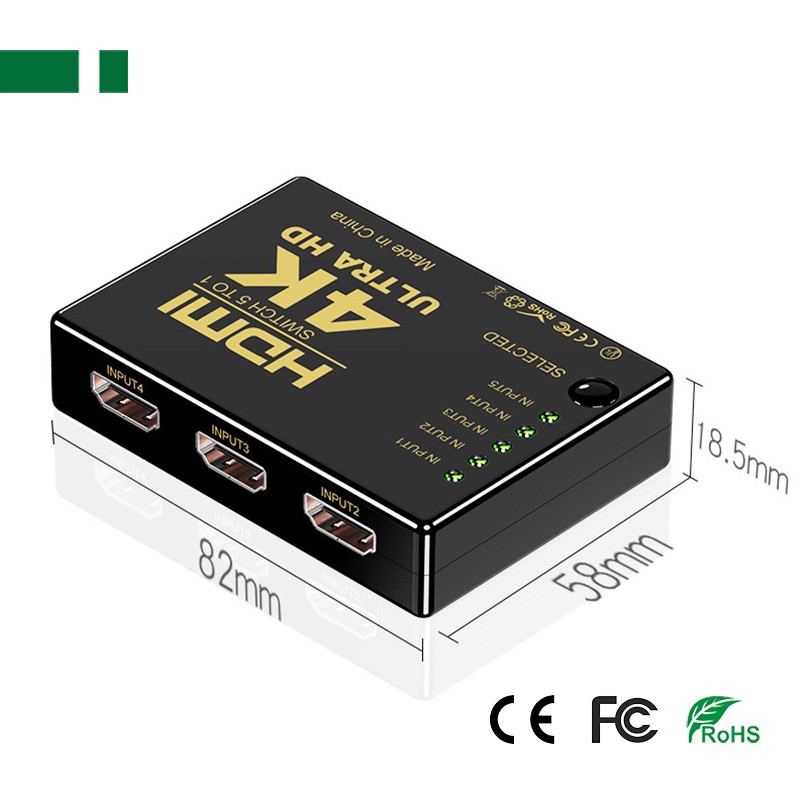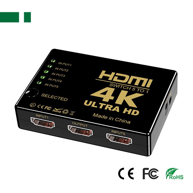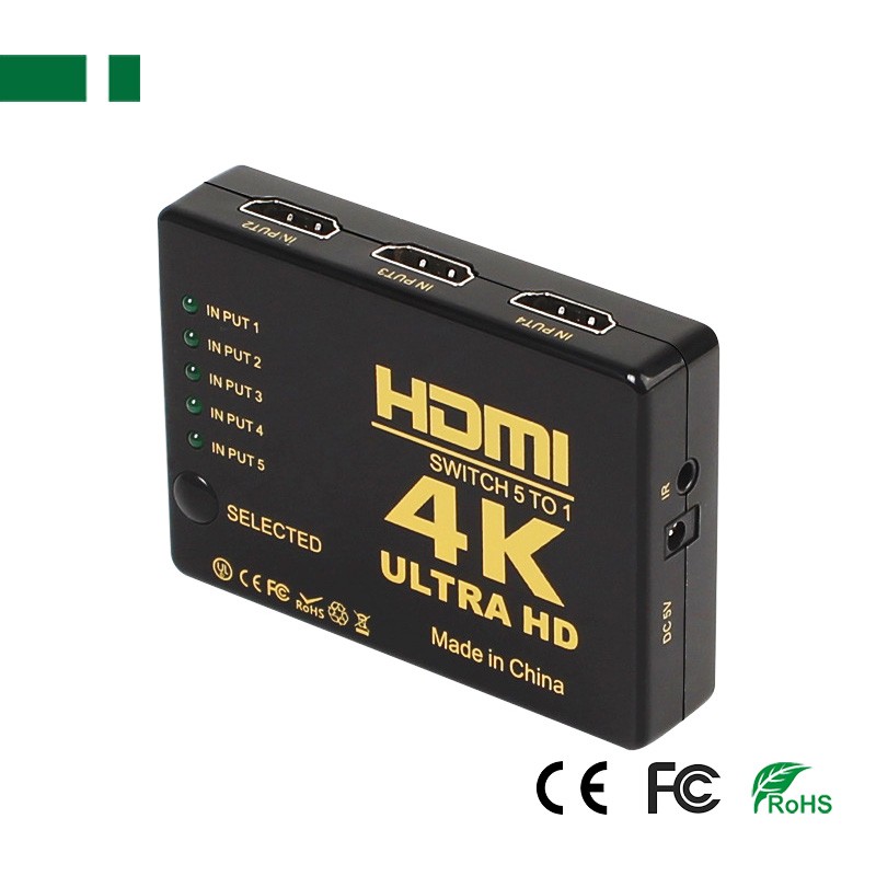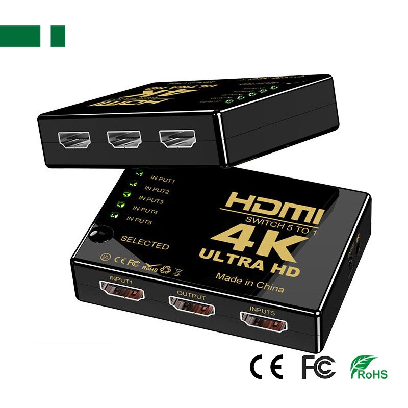 The 5 input to 1 output HDMI Switcher routes high definition 4K*2K video and digital audio from any one of the 5 sources to display unit.