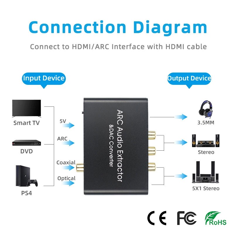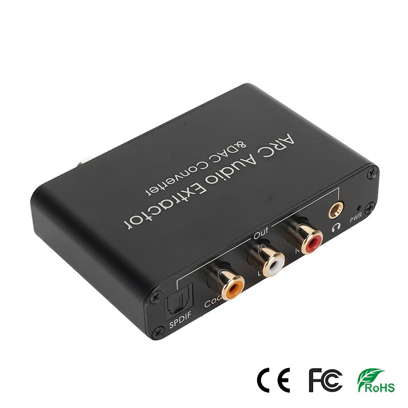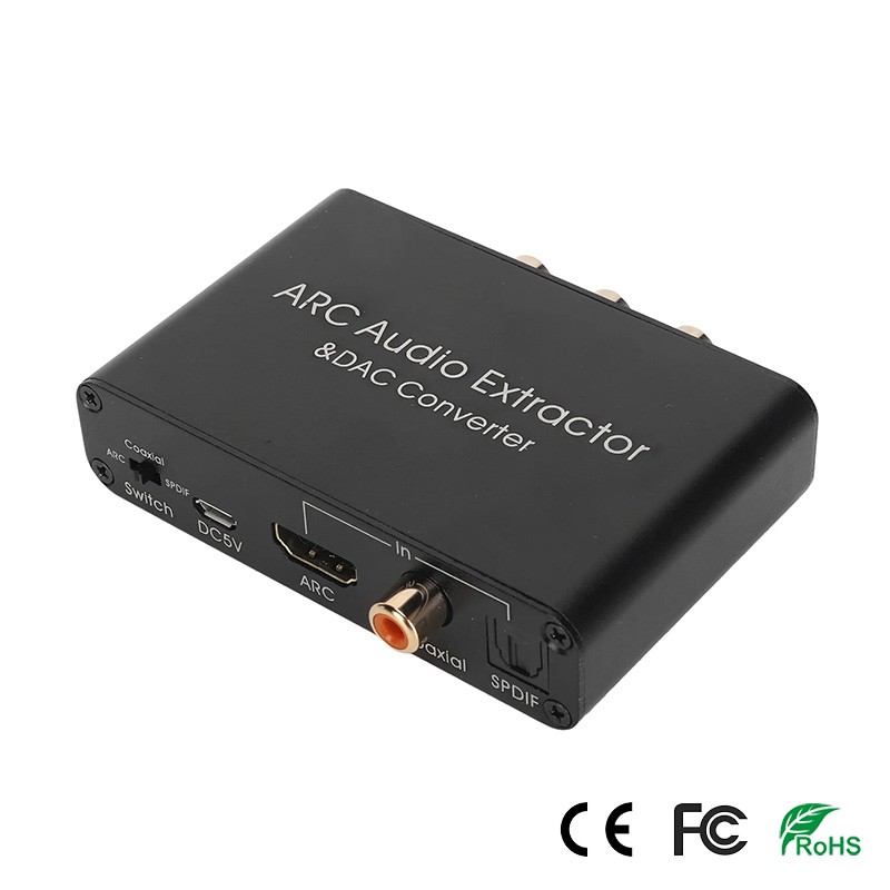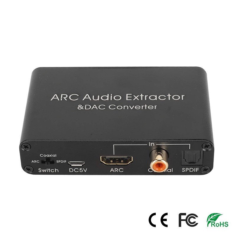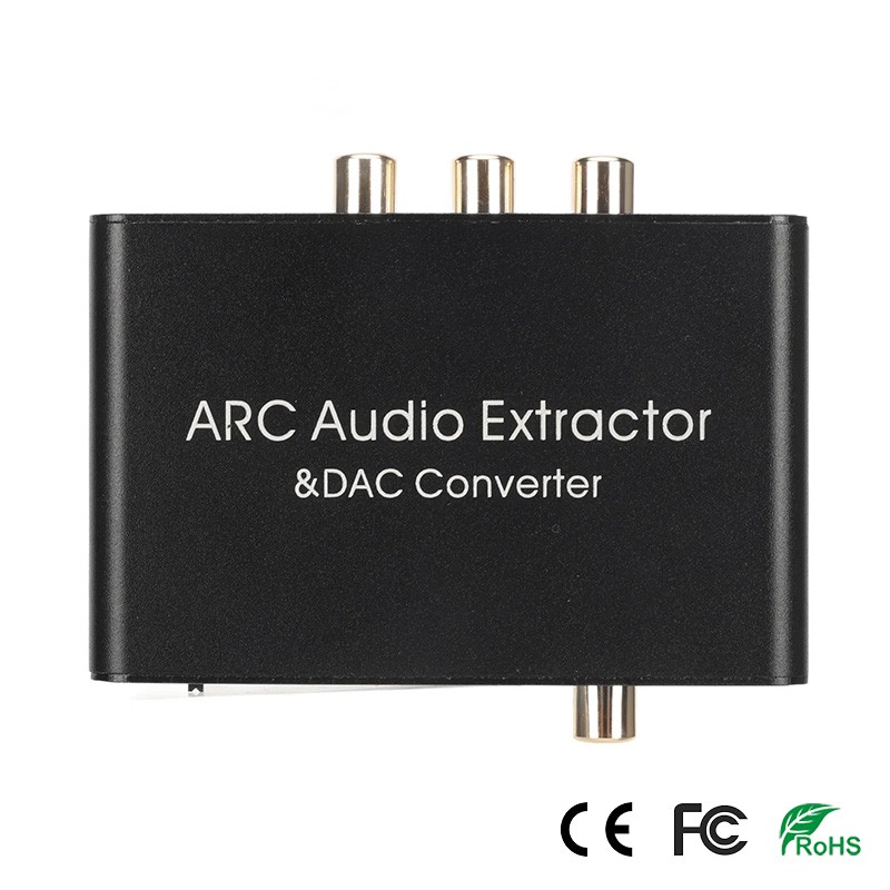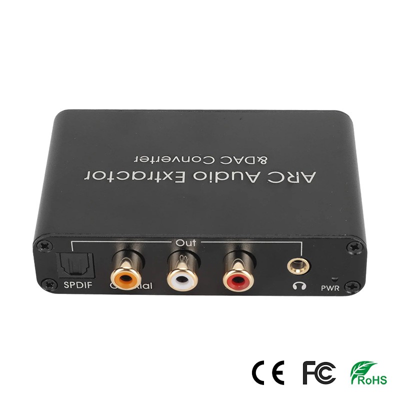 2. Input And Output: ARC Sound Extractor Supports high definition multimedia interface ARC, optical, coaxial input switching function; Supports optical, coaxial, RCA stereo, 3.5mm stereo headphone output simultaneously.