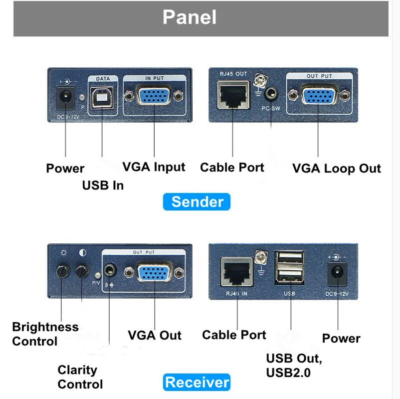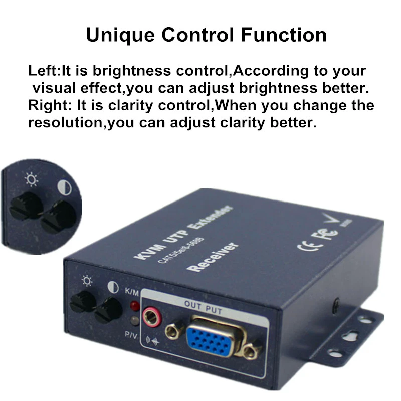 VGA KVM extender provides extension of VGA video audio signal long distances over a single Ethernet RJ45 CAT5/5e/6 cable, it supports high resolution up to 1920*1440@60Hz and keyboard/mouse signal and vga loop out signal transmission
