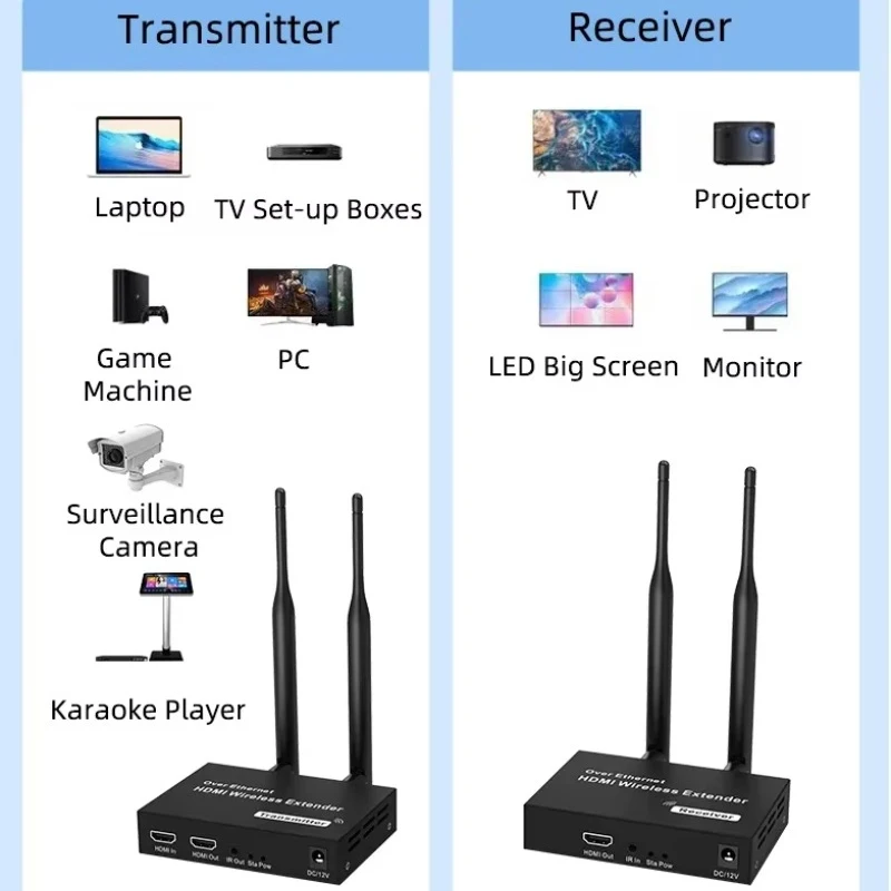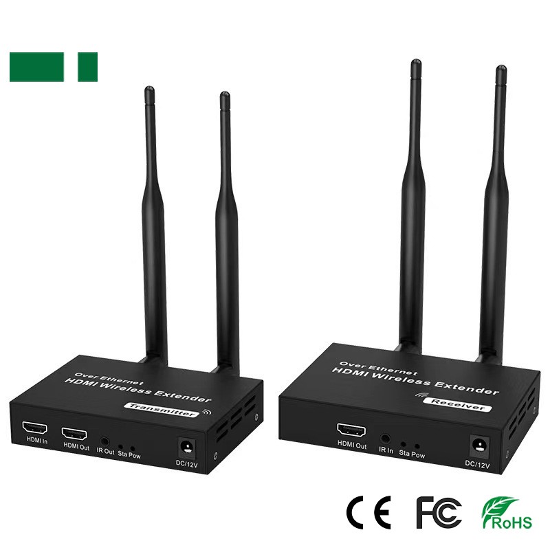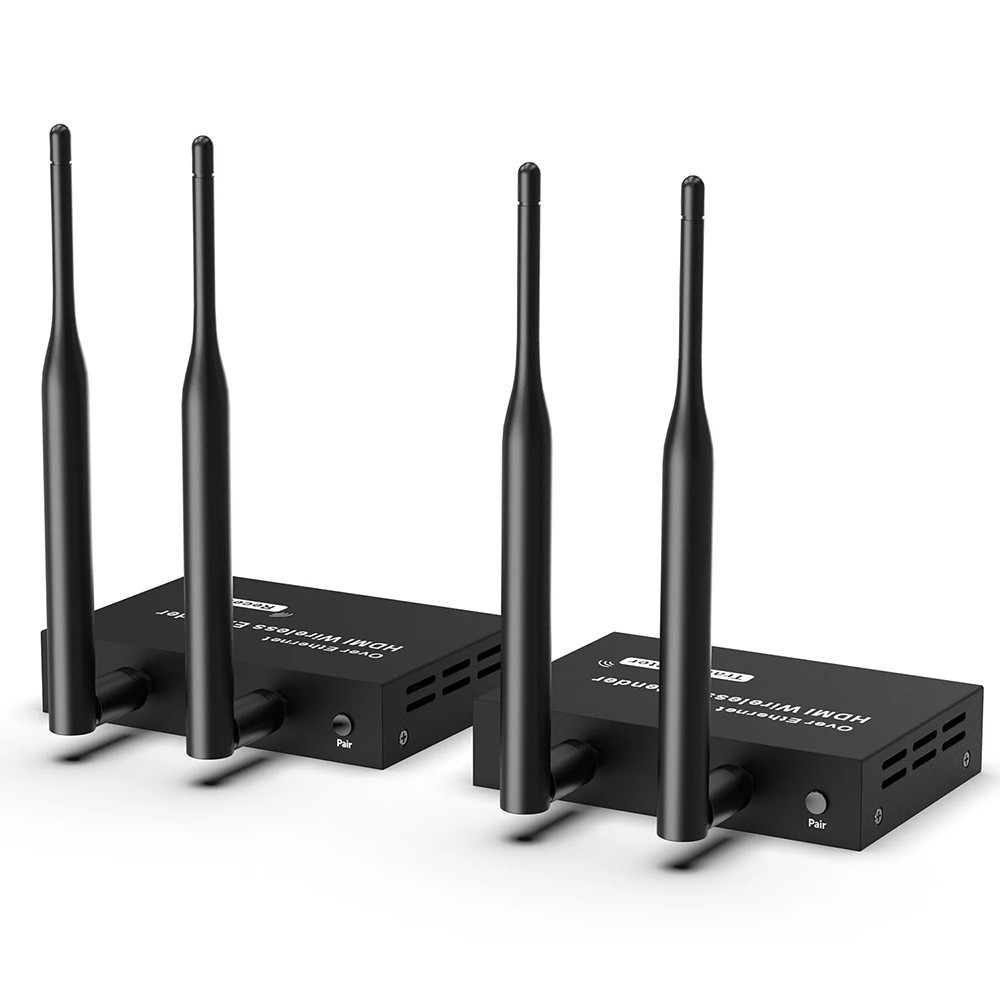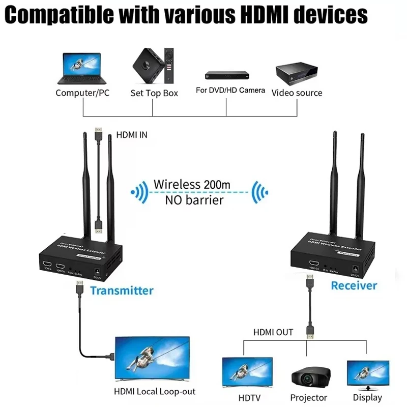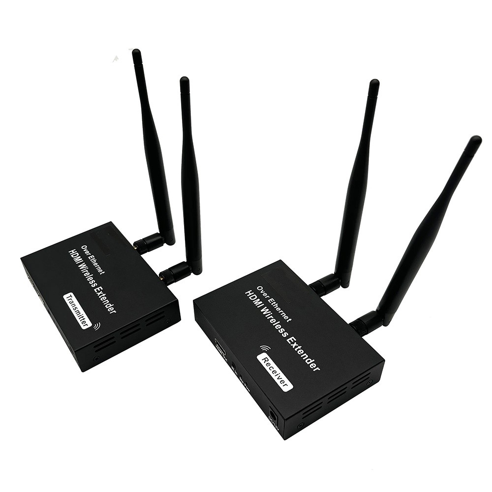 1080P 200M Wireless HDMI Extender HD OUT: 1080P@60Hz Transmission distance: 200M Frequency:2.4GHZ/5GHZ wireless dual-frequency transmission antenna