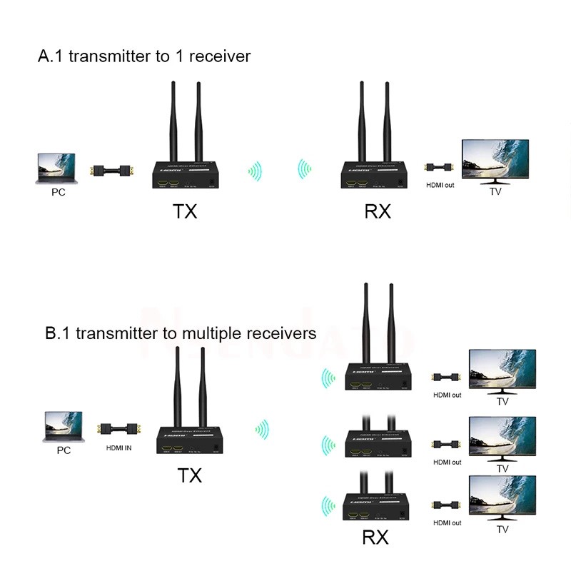 DVD/Laptop PC/HD Camera/Smart Phone/TV Box etc. ; RX can work for HDMI-TV/Projector/Displays