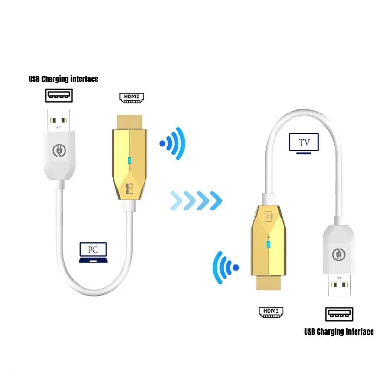 HDMI-compatible wireless transmitter&receiver Resolution: 1080P 60Hz Transmitter interface: HDMI-compatible, USB power supply Receiver interface: HDMI-compatible, USB power supply Function: point-to-point wireless transmission Wireless frequency: 5.8G Interface: nickel plated Shell: ABS Cable length: about 60CM Wire diameter: about 3.5MM