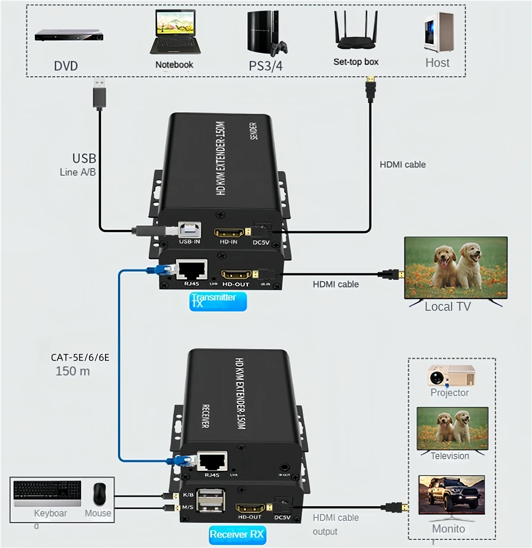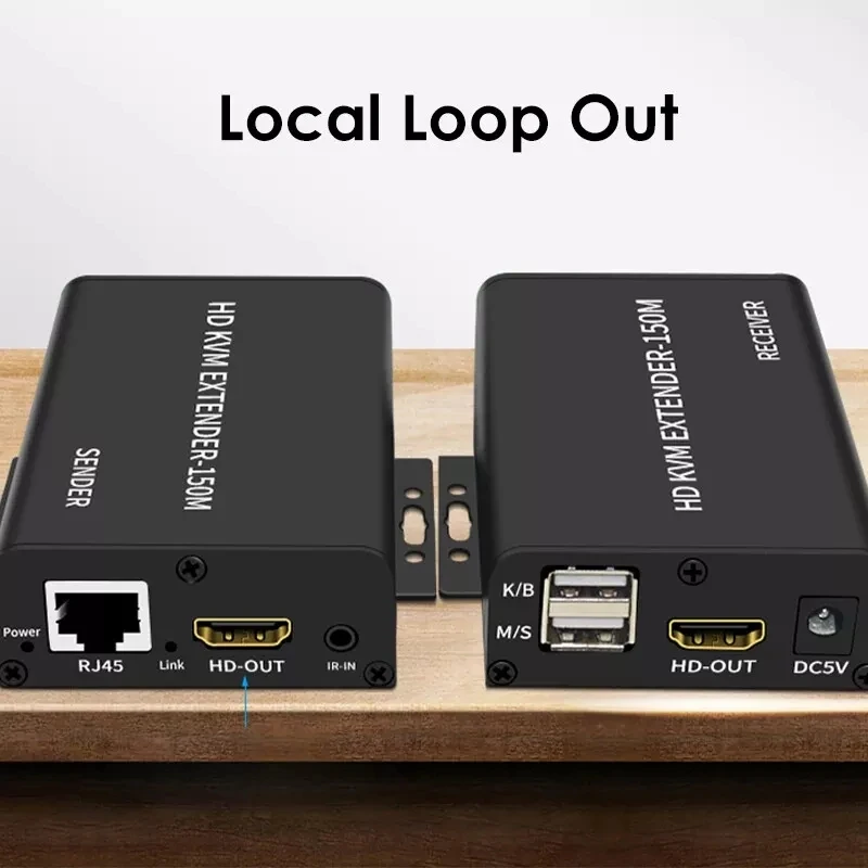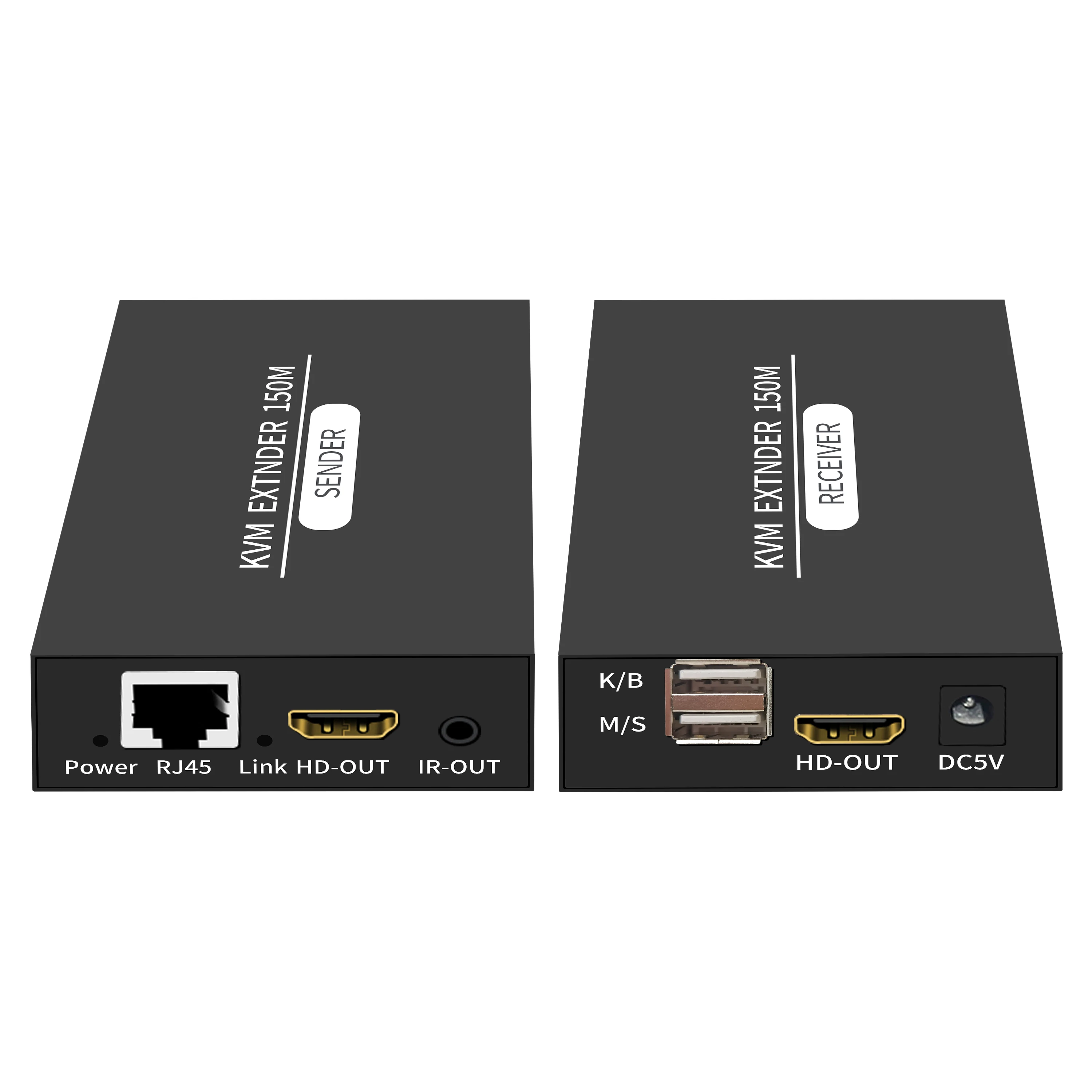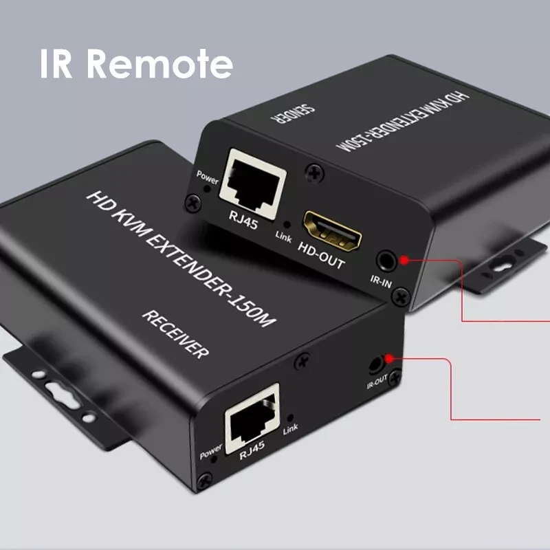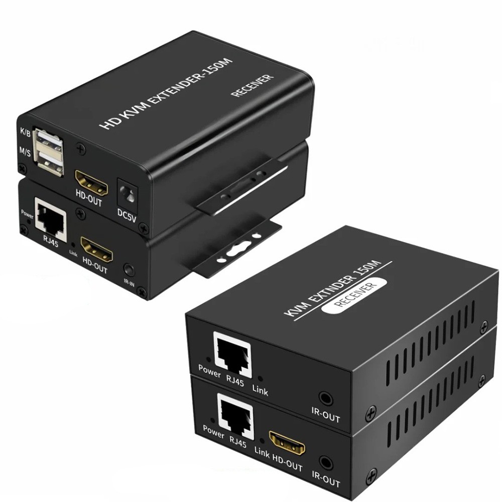 150M KVM IP Extender, 1080P, Length of CAT-6/CAT-5E cable between Rx and TX: Up to 150 meters; Both the TX and RX support 3.5MM audio output; Support IR remote control; Support USB mouse and keyboard