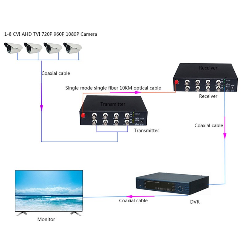 The Coaxial HD Fiber Converter is designed for long-distance optical fiber transmission HD-CVI/ AHD/ TVI composite video, and adopts self-developed uncompressed digital photoelectric conversion technology. Use fiber-optic point-to-point transmission of megapixel HD video for video transmission without delay and high reliability.