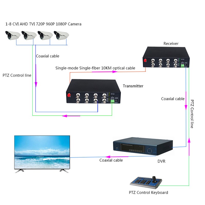 The Coaxial HD Fiber Converter is designed for long-distance optical fiber transmission HD-CVI/ AHD/ TVI composite video, and adopts self-developed uncompressed digital photoelectric conversion technology. Use fiber-optic point-to-point transmission of megapixel HD video for video transmission without delay and high reliability.