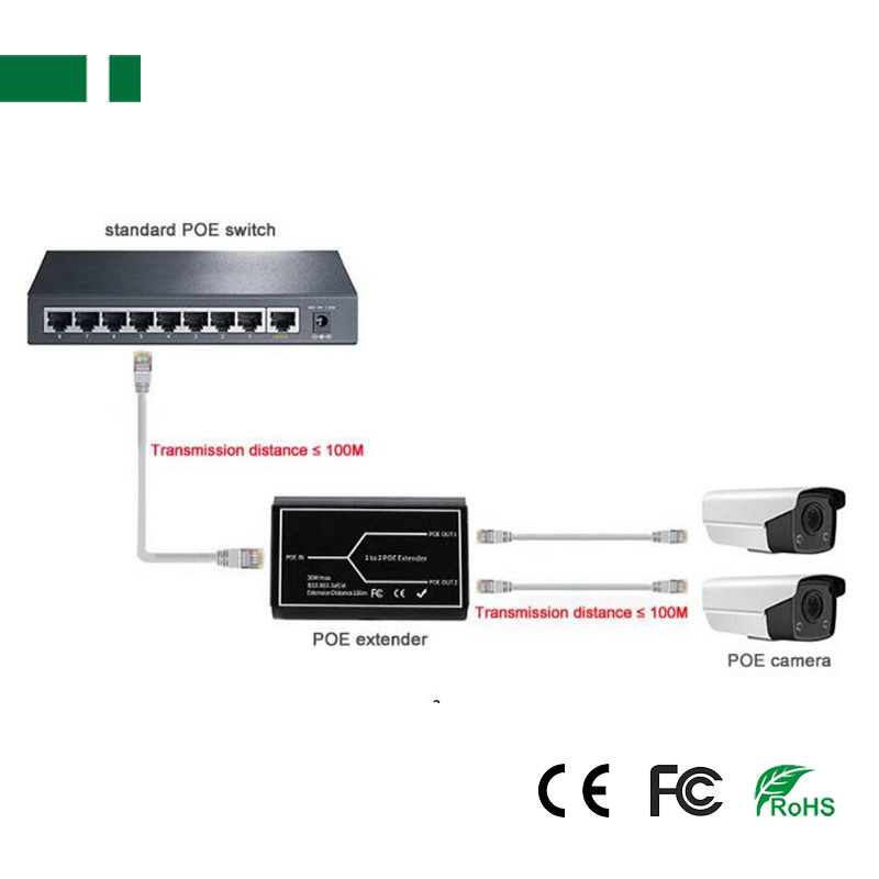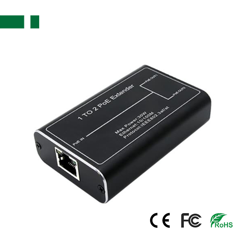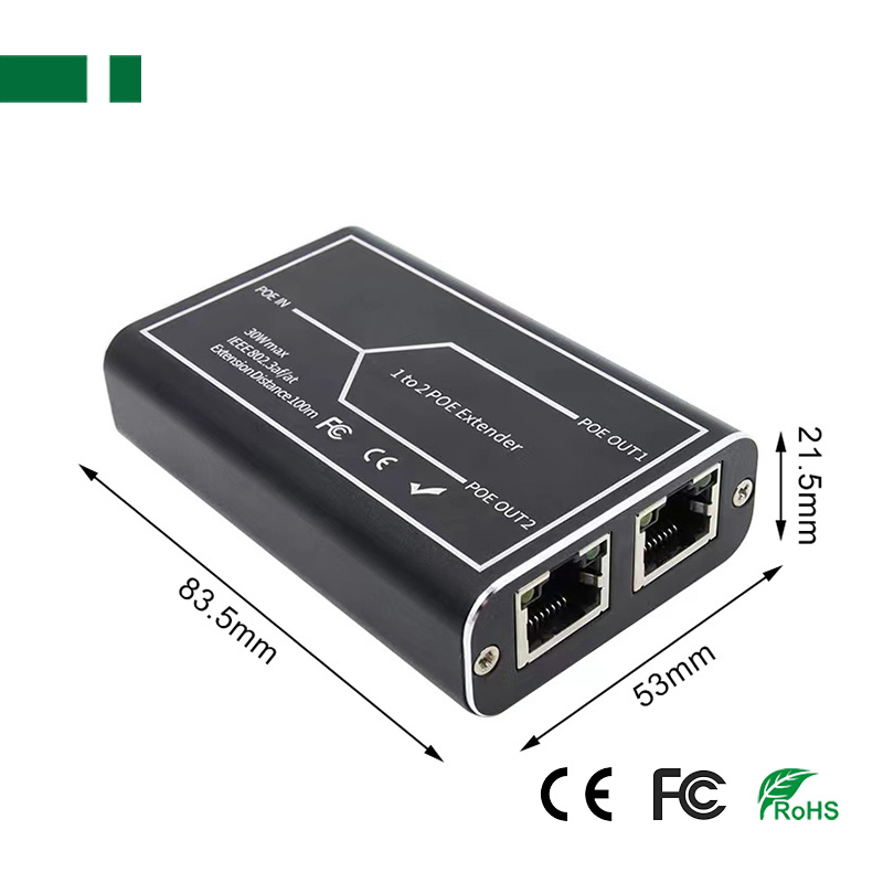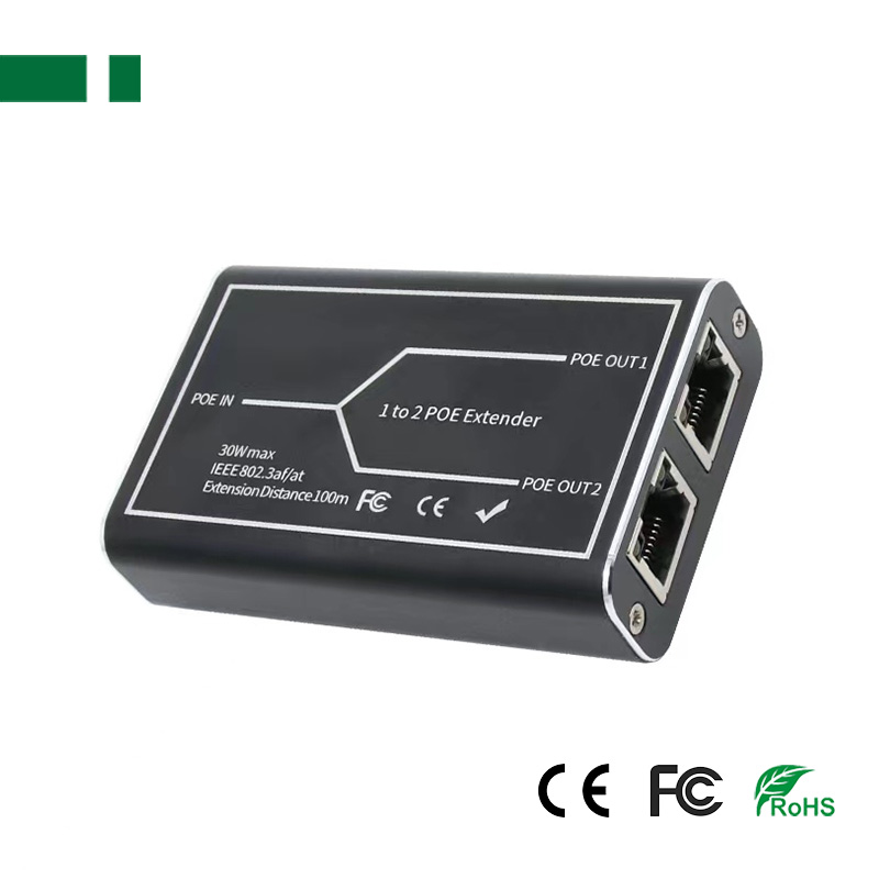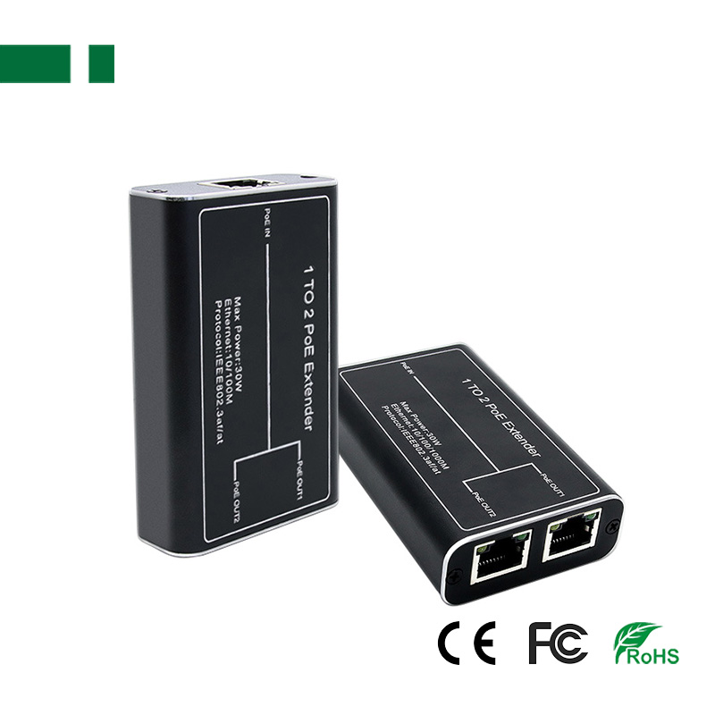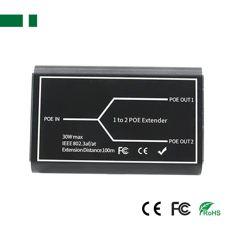 The POE extension device provides two 100Mbps power supply ports and one 100Mbps up-link power supply port. 1-2 ports support IEEE 802.3af/at standard POE power supply, and the POE power of a single port is up to 30Watt.