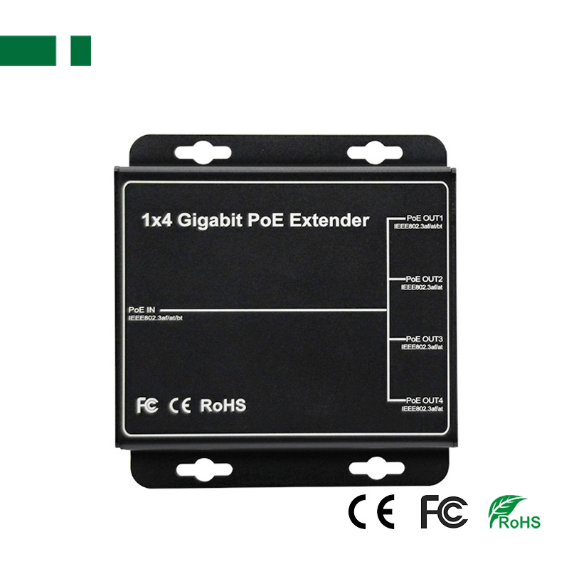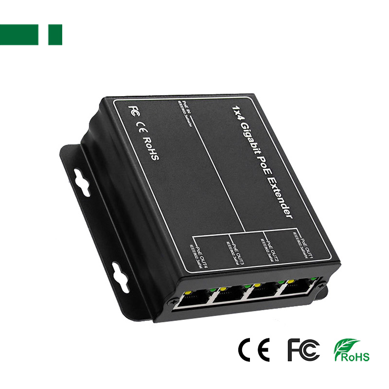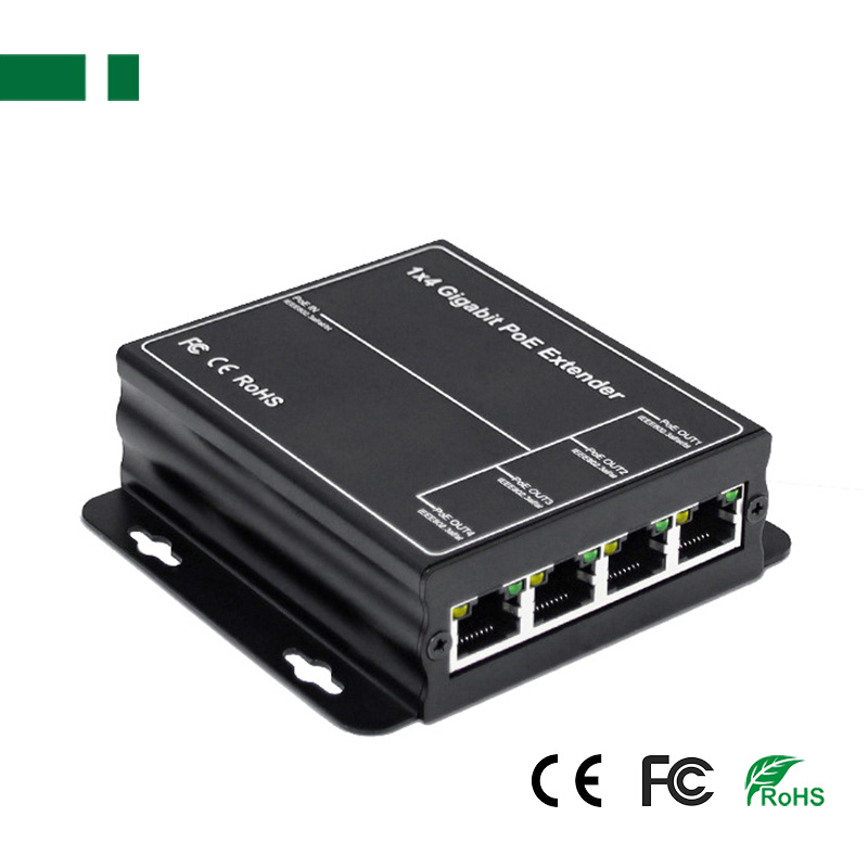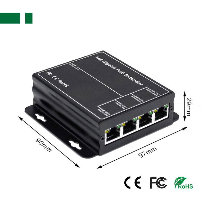 The POE extension device provides four 100Mbps power supply ports and one 100Mbps up-link power supply port. 1-4 ports support IEEE 802.3af/at standard POE power supply, and the POE power of a single port is up to 25Watt.