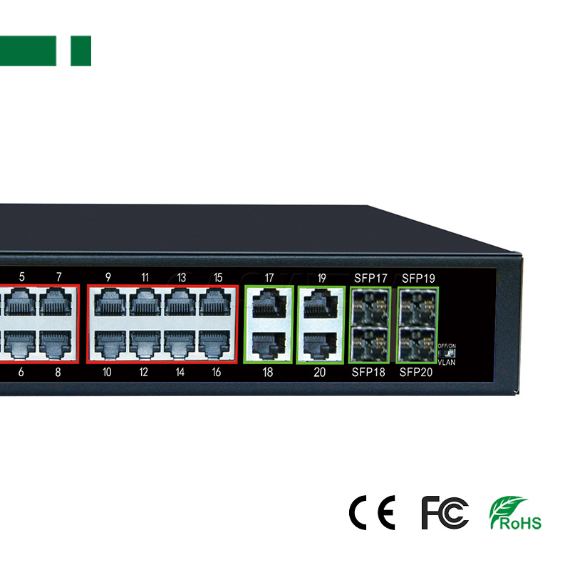 1. 16 ports 10/100/1000Mbps POE Switch with 16 ports PoE ports and 4 Uplink ports and 4 SFP ports;