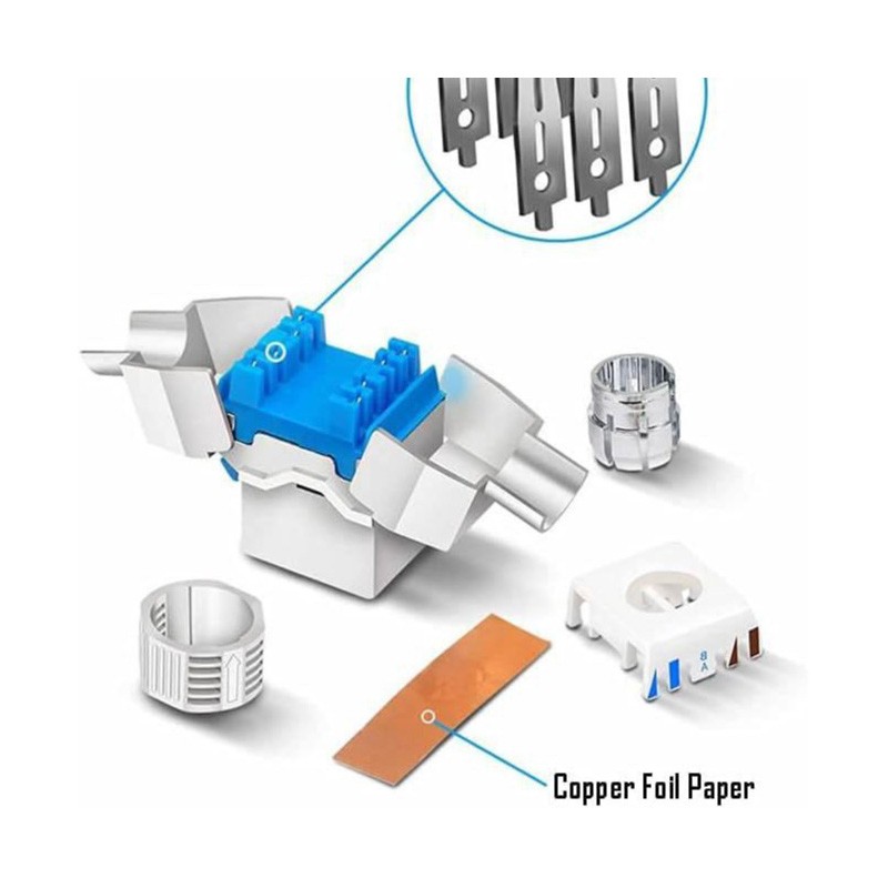 4.Superior construction combines a one piece metal keystone with an integrated silencing cylinder to suppress EMI and NEXT electromagnetic noise and crosstalk; Copper foil tape and cable ties ensure a professional installation and additional shield; Snap-in Cat8 keystone jack with a retaining clip ensures a secure connection