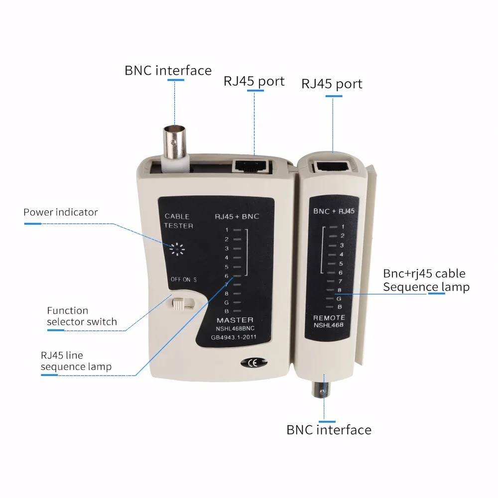 Tests RJ45 cables, RJ11 telephone cables and Network Cables