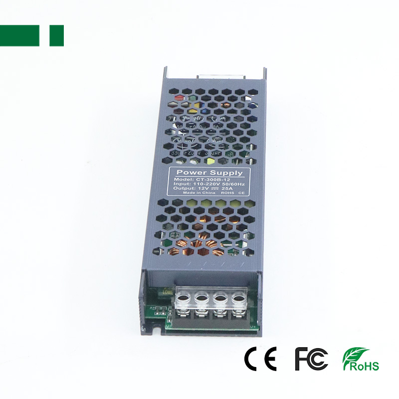 | CT-300B-12 | DC12V 25A 300W | 110~220VAC | 2.7A/115V, 1.35A/230V | 310*53*22mm | 336g |