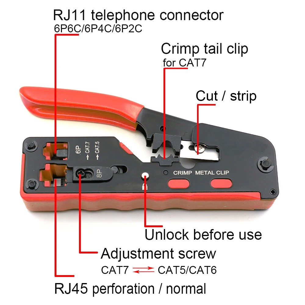 Multifunctional Network Pliers is designed to perform multiple functions, Support for CAT5e, Cat6, and Cat7 cables, this tool is suitable for a wide range of network cabling needs.