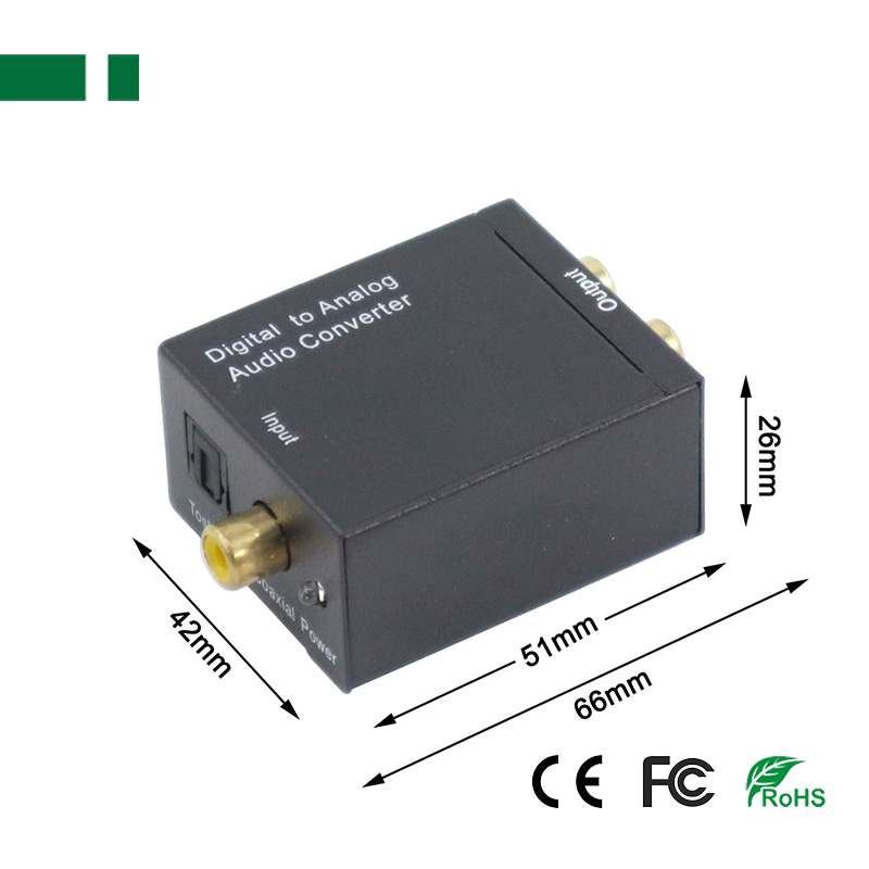 Digital to Analog Audio Converter, Converts coaxial or toslink digital audio signals to analog L/R audio and connects to an external device such as an amplifier via standard RCA jacks; Supports uncompressed 2-channel LPCM digital audio signal output