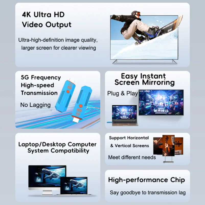 The HDMI wireless transmitter adopts the standard Wifi protocol and transmits high-definition audio and video signals through 5G WiFi, which can be used for DVD players, players, PCs, etc