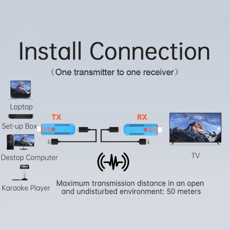 1. Transmit HDMI video and audio signals over long distances via WiFi, up to 50 meters in length;